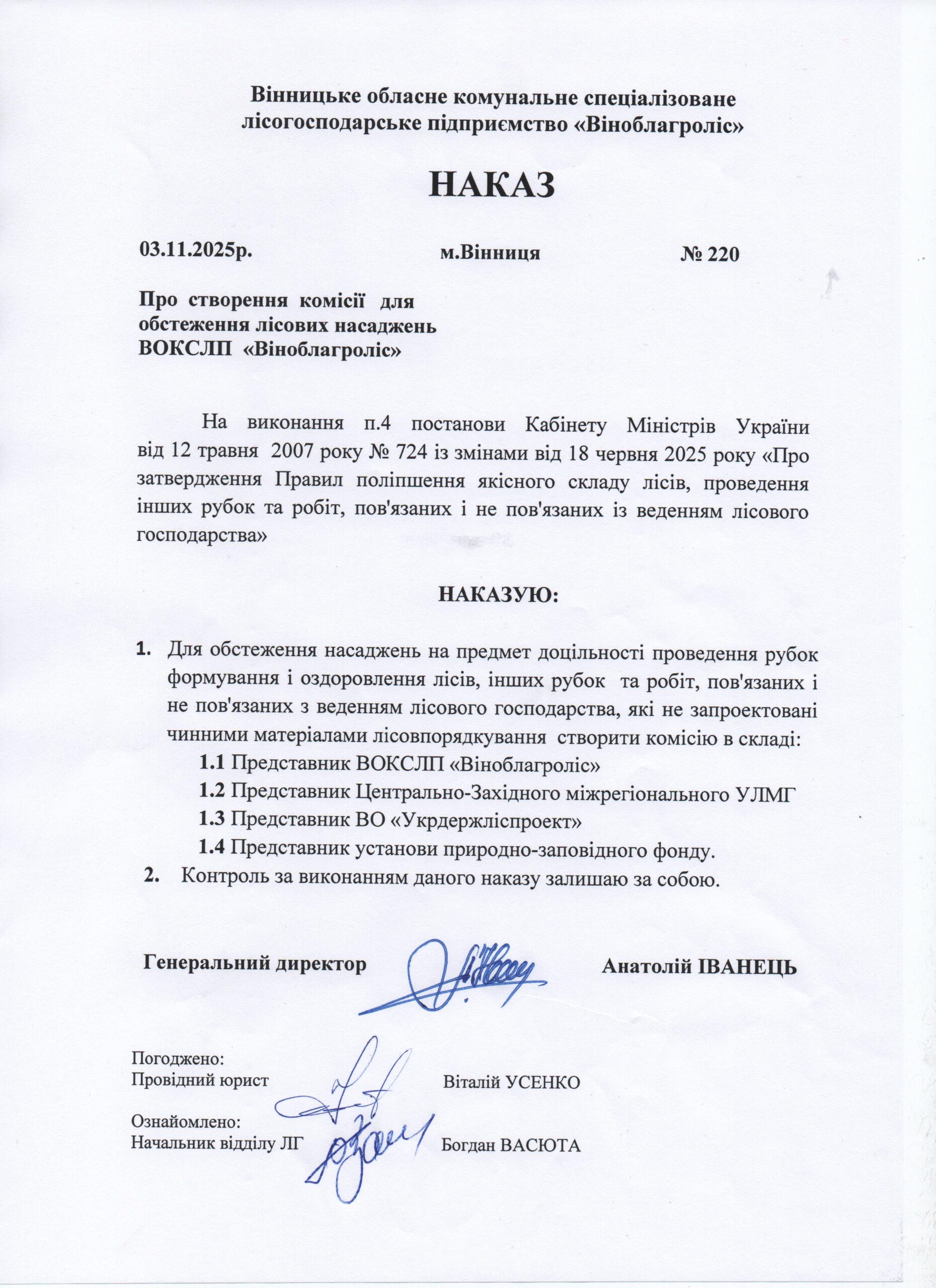 - Наказ про створення коміссії для обстеження лісових насаджень ВОКСЛП “Віноблагроліс”